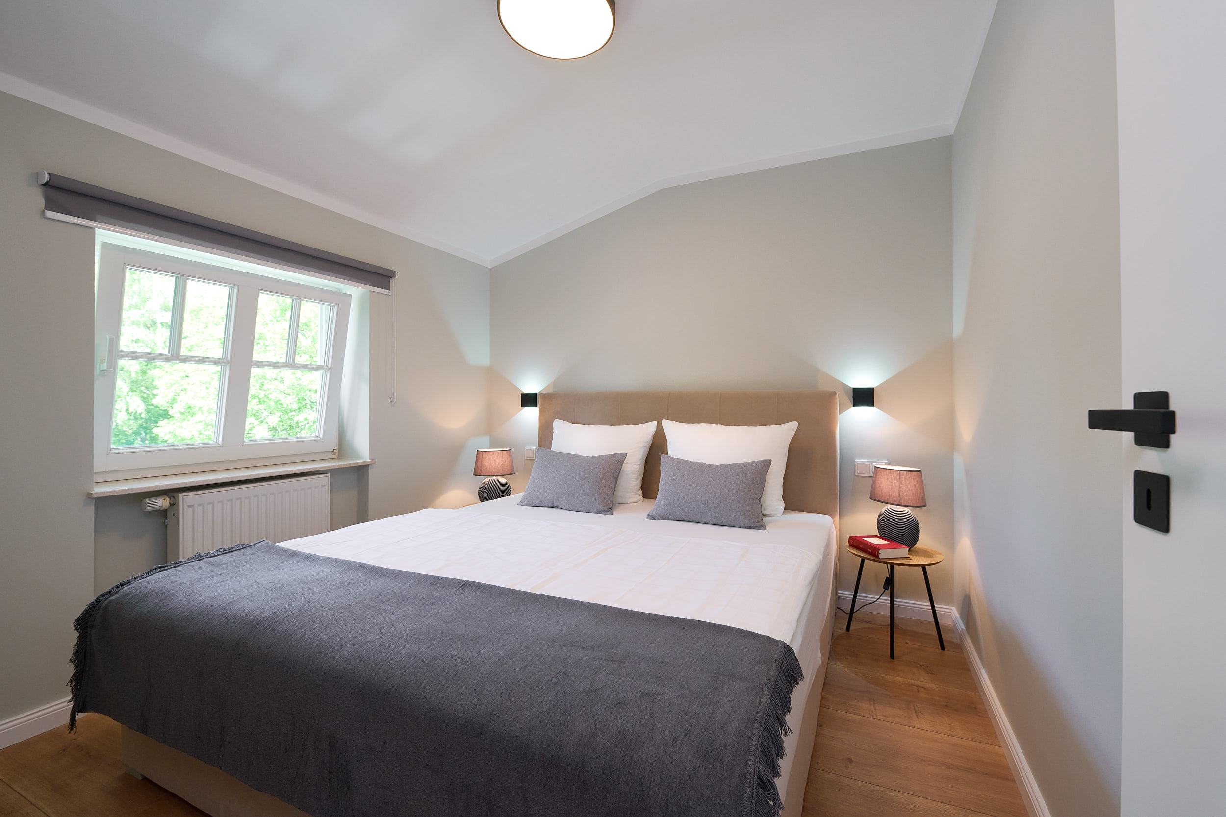 Das gemütliche Schlafzimmer mit Doppelbett und das Bad mit Dusche vervollständigen das kleine, feine Appartement in Baabe auf der Insel Rügen.